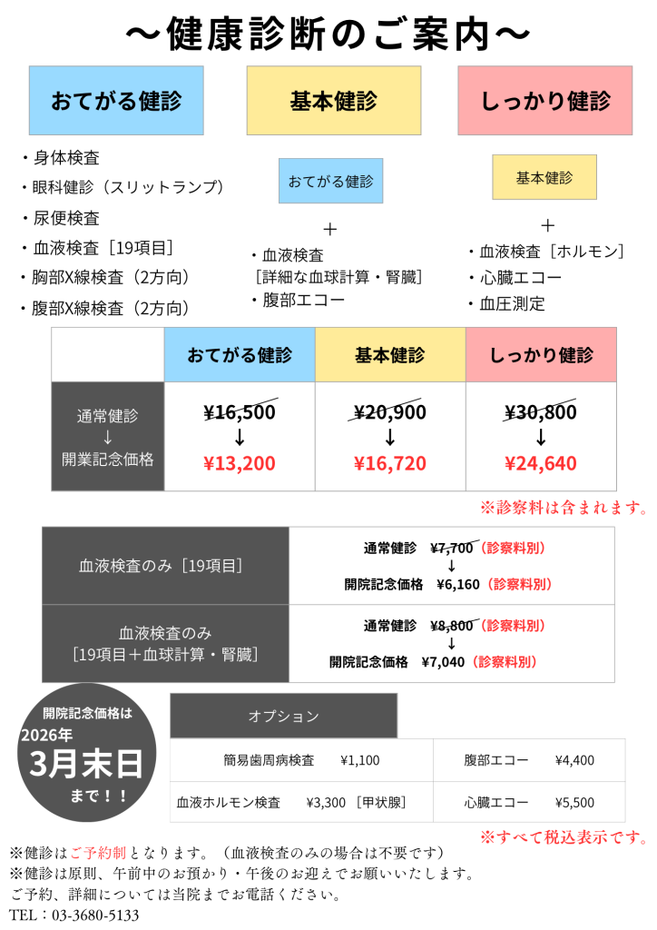 健康診断の内容は、複数の検査を希望される方のための「健康診断コース」と、まずは血液検査から希望される方のための「血液検査コース」をご用意しました。さらに、開業記念として2月末3月末まで健診費用から20%割引のキャンペーンを実施します。ご興味がありましたらお得なこの機会にぜひご利用ください。